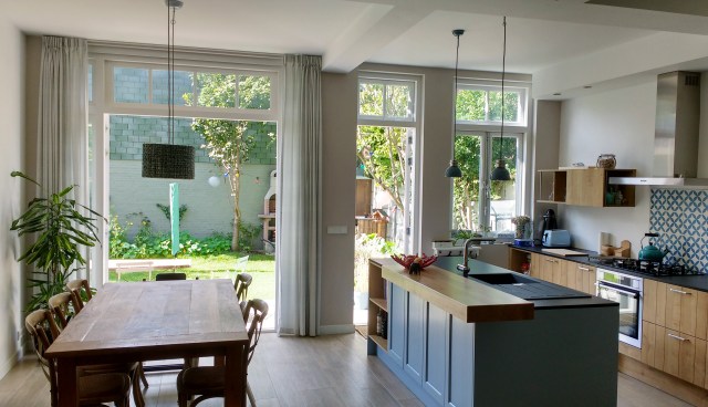 Van een reeks onoverzichtelijke ruimtes met inpandige kamers is een open en ruime vierkamerwoning van 132 m² gemaakt. Omdat er weinig over was van de oorspronkelijke opzet van rond 1910, met een wintergevel en een zomergevel, is de hele plattegrond op de schop gegaan. De open zomergevel is nu de gevel die aan de 100 m² grote tuin op het zuidwesten grenst.